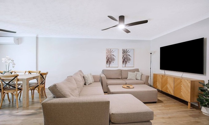 Set on the second floor with stair access only, an inviting, open layout and modern conveniences will make you feel right at home, with a fresh, light palette and pared-back furnishings creating a laidback space to relax and entertain. In the living area, a large, U-shaped sofa provides ample room to settle in with your favourite TV series, while split system air-conditioning and ceiling fans ensure year-round comfort.