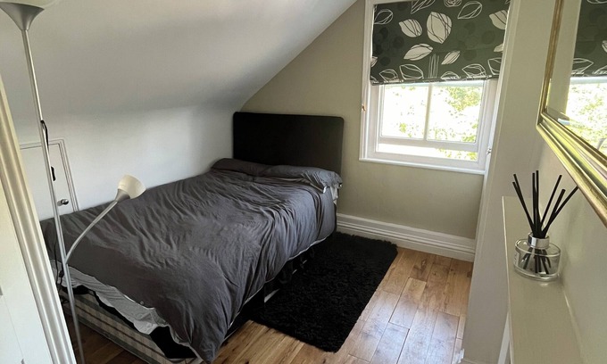 Top floor. Cosy. 1 bed. Full apartment. Ensuit bathroom. Spare double futon available in living room. Tv. WiFi. Coffee tea and kitchen facilities. Fridge. Iron. Ironing board. Shower. Only 5 mins walk to station next to an Aldi. With parking available.