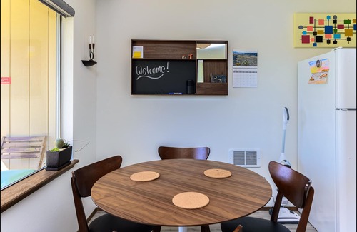 The bedroom features a high-quality king bed and a 42" wall-mounted TV to help you wind down at the end of your day. A full kitchen is stocked with pots, pans, flatware, and everything you need to cook your own meals before enjoying them at the adjacent dining area. You'll enjoy by the new countertops and bright tile backsplash. They really give the kitchen a modern look that will have you saying, "Wow."