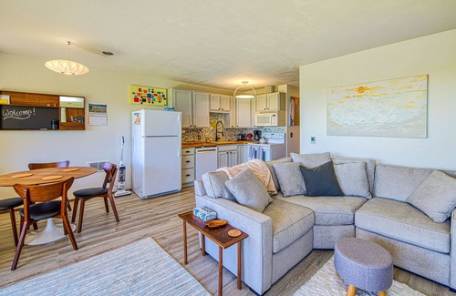 The charming living & dining areas boast all new, mid-century modern furniture for a fun and unusual vibe. In the living room, you'll find a big new sectional couch, coffee, table and comfortable lounge chair, all centered around a flat screen TV with DVD player, with a wood burning fireplace. From here, you can take in the tremendous view of the Pacific Ocean, the dunes, and the seabirds that fly around them. In good weather, you can adjourn to the private deck to enjoy the fragrant sea air.