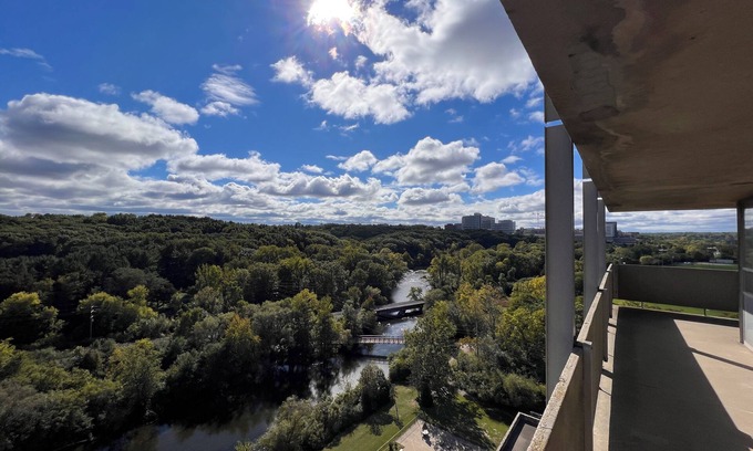 This newly renovated 11th floor suite is the perfect place to relax and unwind while taking in the stunning natural beauty of the Huron River and Nichols Arboretum. With oversized windows and a spacious balcony, you'll feel like you're floating above the treetops.