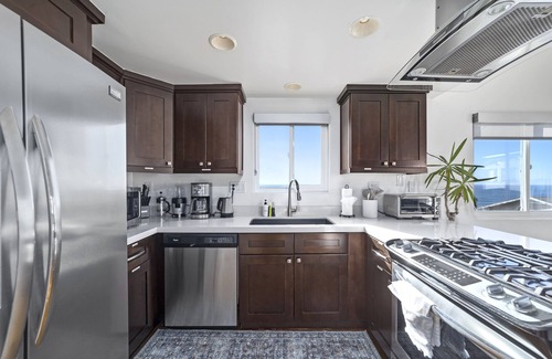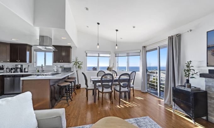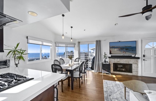 This top-floor newly renovated condo offers an unforgettable coastal escape with views from Catalina Island to the Malibu Mountains. The unit provides comfortable sleeping accommodations for up to four guests (2 queen beds), with spacious, tastefully decorated bedrooms and cozy linens to ensure a good night's rest. Each bedroom can utilize their own updated bathroom, ensuring comfort, privacy and convenience. The fully-equipped open-concept kitchen has everything you need to prepare delicious meals from home, complete with modern applications, all the necessary cookware and glassware, a 6 seater dining table as well as 3 kitchen bar stools. On the private balcony, you will find a propane grill and a small table so you can dine alfresco. There is also an indoor gas fireplace if you want to snuggle up on the couch and get cozy on those breezy winter nights. With our high speed (1 Gig) WI-Fi and two smart TVs, you can comfortably work and stay connected from home during your stay.