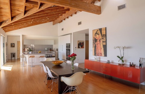 Our recently remodeled home is 3400 square feet with an additional 2200 square feet of outside patio and rooftop terrace overlooking Los Angeles from downtown to the ocean. Modern furniture imported from Italy, Poggenpohl island kitchen with Miele appliances. Modern bathrooms with free-standing tubs and chrome appliances. Hardwood floor throughout. High ceilings with high doors. Piano, two 75-inch 4K HD TVs with professional surround sound system. Free Internet. Remote shades. Frameless sliding doors bring a breathtaking view over the canyon and city lights into your living space—indoor/outdoor feel. In addition to the spacious patio, there is a rooftop with an open fireplace and a bar with a 360-degree view of the Ocean, the Getty Museum, Canyon, Mountains, and Downtown Los Angeles. The house is located in the Hills of Bel Air. Modern. It's quiet, yet close to the ocean and city life. Five minutes to Sunset Boulevard, Westwood's shops, movie theaters, and restaurants. Ten minutes to Hollywood with its bars and nightlife, 10 minutes to Brentwood with restaurants and shopping areas, 15 minutes to the ocean, and 15 minutes to the airport. You are on top of the world and in the middle of everything, yet it has the quiet, relaxing feel of a mountain retreat.