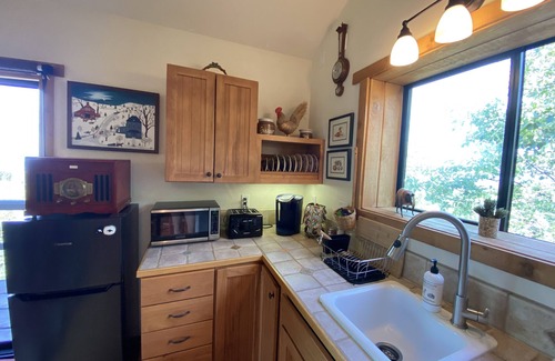 This charming studio has a queen size bed, bathroom with bath and shower, kitchenette with Keurig coffee maker, medium size fridge, microwave, stove, toaster and blender for your use. Enjoy the large deck and morning sunrises straight from your bed.