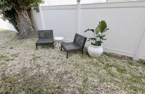 The apartment has a full kitchen and living area with a huge L-shaped sofa which expands to reveal a comfy queen-sized bed. The unit includes a private bedroom guest bathroom, a cute little outside seating area, and a separate front entrance.