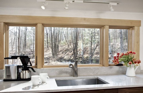 Brook Cottage occupies the east wing of an authentic 1928 artist’s residence/studio, and features oversize north-light windows (with views of Overlook Mountain, the highest peak in the region) and a south-facing wall of glass with forest and brook views.