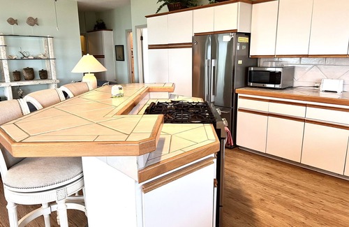 Kitchen: Equipped with gas range stove / oven, refrigerator with ice maker, dishwasher, microwave, pots, pans, cooking utensils and cutlery for 6 guests. Breakfast bar with 4 bar stools.