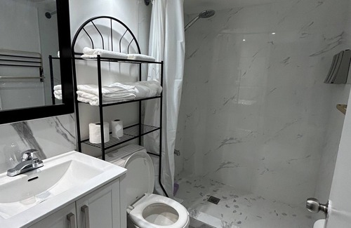 **Modern Bathroom**: A clean and updated bathroom equipped with fresh towels and toiletries.