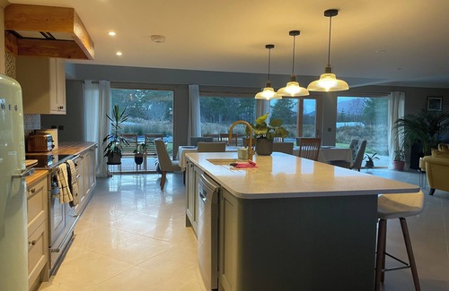 The house has a spacious open plan living room and kitchen area, with comfy sofas, wood-burning stove, Sky TV & bar area.