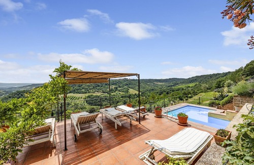 The mosaic-lined pool is slightly below the house on a terrace in the hillside. It has sun loungers and a raised shaded area, where guests can relax and take in the stunning views. For children there is table football, a trampoline, table tennis and a games library.