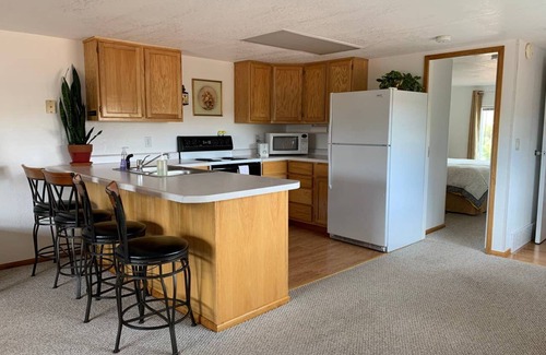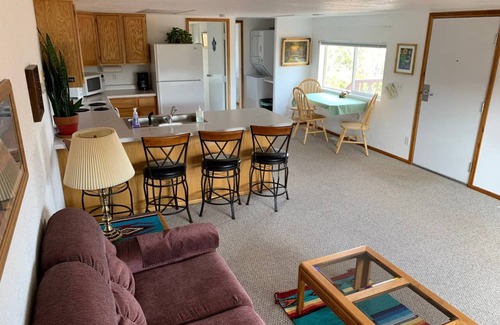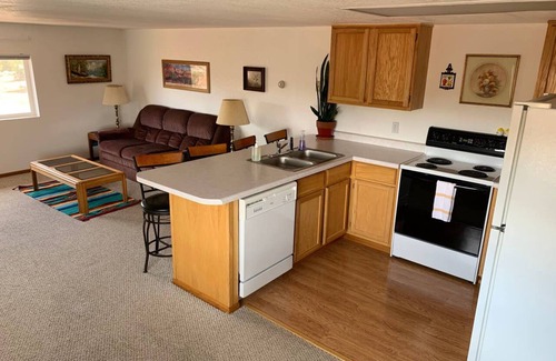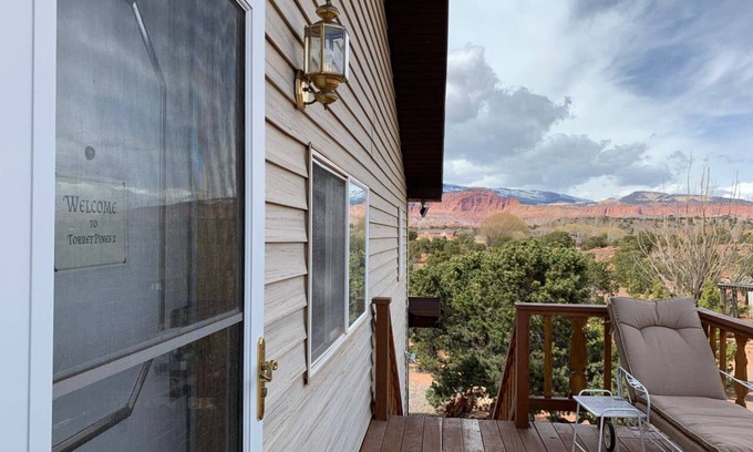 Private upper floor apartment amongst the pinions overlooking Torrey. You will have beautiful mountain and red rock views from the deck and inside there is a spacious living room with pull-out-bed sofa , full kitchen, 3/4 bathroom, laundry room, and a king bedroom. This comfortable apartment is tucked away in a central location near the intersection of highways 12 and 24. Disc Golf Course on property (See Udisc.com and bring your own discs). **************************************************** If you choose to book, read the messages we send to you within the VRBO messaging system. App with notifications/textmessage enabled is recommended. *****************************************************Do not arrive before 3 PM without permission. *****************************************************No pets allowed, including ESA. Pet friendly lodging is available at The Rim Rock Inn. If you will be bringing a working service dog, please tell me. ****************************************************** IF YOU ARE PLANNING TO ZOOM OR OTHER LIVE STREAMING VIDEO CALLS OR LIVE INTERNET WORK, DO NOT BOOK US (live meaning that buffering is inappropriate or unavailable). Our internet is good and works well for casual internet use and tv/music streaming (buffer will prevent pause), but it fluctuates and drops for about 3 seconds every few minutes, so your zoom meeting will drop. We can offer no promises of internet stability.