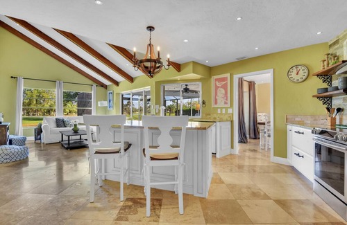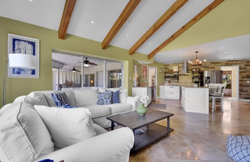 Your peaceful Florida retreat! Torrey Pines is a spacious, newly renovated single family home in Lely Country Club, conveniently located near many of Naples best golf courses and just 15 minutes from the beaches of downtown Naples. A heated pool with sun shelf overlooks the Royal Palm Country Club golf course and a screened lanai keeps the bugs out as you enjoy indoor outdoor living in your covered patio area. Inside, the home has been stylishly renovated in a contemporary style with wood plank tile flooring throughout, designer bathrooms with glass enclosed showers and an open concept kitchen and family room that flow out to the covered lanai. All bedrooms and the family room have mounted HDTVs with full cable service and the home, as with all rentals from The Holiday Life, is furnished with high speed WiFi, a full suite of quality white linens and toweling, and a fully equipped kitchen. If you are seeking a luxurious, executive-style single family home rental in Naples, you have found the dream at Torrey Pines!