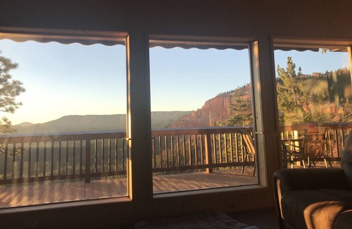 This cabin is located in Duck Creek Village Utah. The cabin is two minutes from Strawberry Point and is also located between Bryce Canyon National Park and Zion National Park. The cabin is 2,026 sq feet, 2 bedroom, 2 bath, +loft sleeping area. Features 3 king size beds and a full size bunk bed for kids. Cabin has super fast Starlink WiFi. Enjoy the massive deck with views of Zion National Park and the pink cliffs of Strawberry Point. Close to several national parks, Cedar Breaks National Monument, Mammoth Cave, hiking, and fishing.