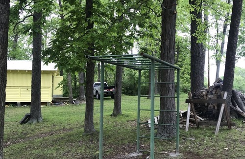The cabin sits on a 3 acre lake surrounded by mature trees, a creek and forest. ATV trails are cut in the woods. Accommodations are rough with two bunk beds in a single 12x24 sleeping room with a single bathroom. An unfinished shower functions with hot water, but is rough. A filtration system cleans water suitable for showering but not drinking. A connected 12X24 screened in porch has views of the lake. One RV hookup is on the cabin and the other is around 60 feet away. The rental is for the full 40 acers and reasonable fishing in the lake if you want to fry up some bass or bluegill. There is a rough dock in the lake. The intent here is to bring your camper and use the cabin for overflow or bad weather, if needed
