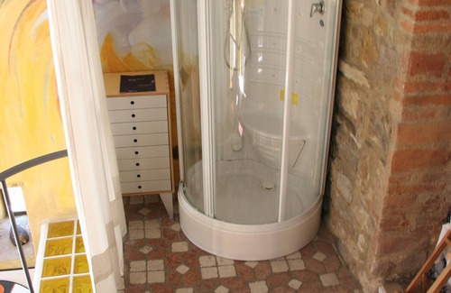 On the ground floor of the tower, loft style, with stone walls, brick arches dating back to 1200, floors of precious marble and vaulted ceilings.