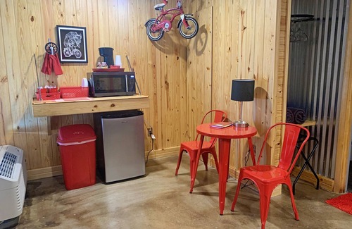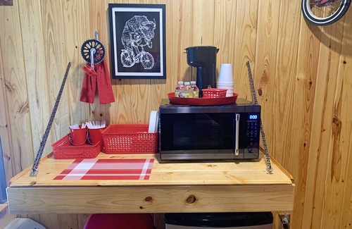 The cabin boasts two luxurious queen-sized beds and a spacious full bathroom featuring a large walk-in tiled shower adorned with glass blocks, ensuring comfort for you and your guests. Enjoy modern amenities like complimentary Wi-Fi, Netflix, and a kitchenette equipped with a mini fridge, microwave, and coffee maker. The outdoor space is equally inviting, complete with a covered picnic area, charcoal grill, and fire pit—ideal for evening gatherings under the stars. Fun-filled activities such as horseshoes, disc golf, and an interactive music wall allow guests of all ages to unwind and connect in a relaxed atmosphere.