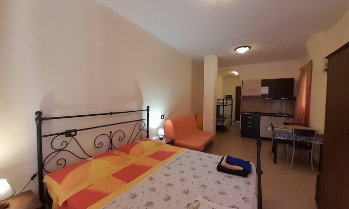 In the Gran Sasso and Monti della Laga National Park, in a breathtaking panoramic area, between Montebello di Bertona and Vestea province of Pescara, rent in Residence, for vacation, three large apartments / Studio, complete with kitchenette, fridge, satellite TV, bathroom with shower, consisting of a double bed, a bunk bed or ready-made sofa. The newly built structure is in anti-seismic reinforced concrete. Swimming pool, private fenced parking, large garden with barbecue and children's play area. Located in the Gran Sasso and Monti della Laga National Park, mountains with a charm suspended in time, the perfect place to combine relaxation and breathtaking panoramic views, at about 700 meters above sea level at the foot of the "Sleeping Beauty" of D Annunziana with a wonderful panoramic view until you see the Adriatic Sea. It is 2 km from the market, pharmacy and post office, 10 km from supermarkets and a bank. The entrance to the Gran Sasso National Park with 15 km of cross-country tracks and snowshoes (ciaspola) is only 12 km, the cross-country trails of the Gran Sasso 22 km, while the beach of the Adriatic Sea is at 33 km . Holidays for a minimum of 2 nights.