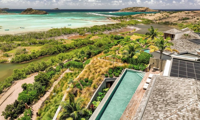 A stuning location on the lagoon in St Barthelemy with 3 bedrooms. This enchanting villa features 2 king beds and 1 queen bed, perfect for a group of friends or family. The cozy atmosphere and high end design mixed with beautiful surroundings will make your stay unforgettable. The athmosphere so peaceful and intimate, beach and snorkeling by walk, Kite surfing spot, hiking in green zone. 5 stars equipments, Gym shared with a nice view. Part of Issayah Villa Domain. A large Carribean carbet to enjoy your diners hearing quit waves and cricket, the garden around you is made with taste as the design with stone on floor and wood and Bambou fabrics on the wall, al the furniture from Italian design with a french touch. Softs drinks included. Perfect Villa to touch the paradise in St Barthelemy. Hotel Le Barthelemy 5 minutes by walk and Le sereno. Private Car Park for 3 cars. 15 minutes in nice road of St Jean Beach or Salines. Nice walk in Toiny for joggers too.