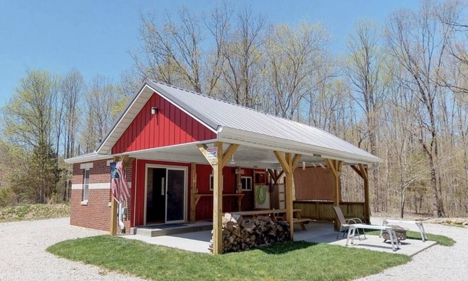 This cabin is a quaint small red cabin in the woods. It has access to 202,814 acres, 266 miles of hiking, horseback riding & mountain bike trails in Hoosier National Forest right outside your door with connecting trails to Brown County State Park. You can hike to the lake if you want a nice long hike. This is perfect for people who love to hike, mountain bike, fish, boat, kayak and camp. Also note that the living space is a studio style cabin. The cabin has a full bathroom with stand up shower. Plus outdoor shower as well. Great after hiking. It does have a small water heater so quick showers are needed. This space has a Double futon and 2 full size mattress bunk beds. It can accommodate up to 5 people max. The outdoor shelter house is one of the cabins best features. Plenty room for a great picnic and s’mores over the fire pit. Also if you have a boat or camper there is a circular drive around cabin for easy turn around and plenty parking.