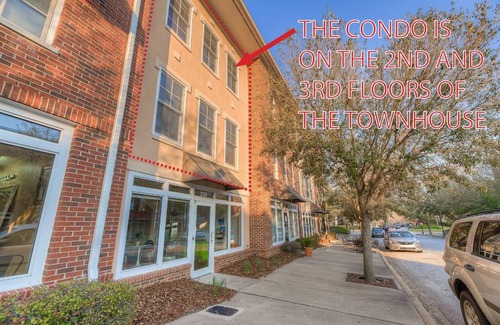This is a two-story condo in the top two levels of a three-story townhome. The ground level has a retail space facing the main road (and street address of the townhouse). There is parking for 3 vehicles in the rear alleyway which is adjacent to where you enter the condo. A stairwell leads you up to the main living area of the condo with a dining room that seats four, full kitchen with peninsula counter seating for two, laundry, a half bath, and a spacious and bright living room with a large TV and a comfy reclining sofa. The stairway from the living room leads you up to the sleeping quarters where two bedroom suites with private full bathrooms and walk-in closets await. The queen size guest bedroom has a desk, nightstands with lamps, a spacious single vanity and shower-tub combo in the bathroom and a walk-in closet. The king bedroom suite has a king size bed, TV, large walk-in closet, and a private bathroom with a soaking tub and double sink vanity.