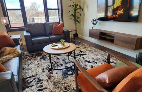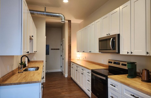 Nestled above a bustling pizza place, our industrial chic condo boasts a rare second-story view of the cute and quaint main street below. Step into a retro gamer's paradise with an electronic pinball machine and a tabletop arcade featuring 412 classic games like Frogger, Pac-Man, and Asteroids. And for some classic entertainment, you'll find the closet is stocked with board games and cards.