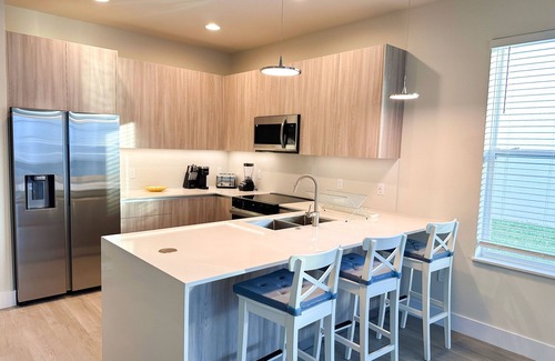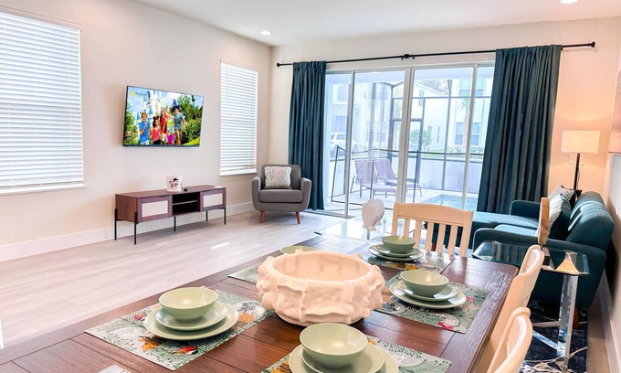 The fully equipped kitchen comes with everything you need for home-style cooking, including a dishwasher, stove, microwave, fridge, coffee maker, cookware, and tableware. The open-concept living and dining areas are both spacious and elegantly styled, offering a welcoming place to gather after a day at the parks—with beautiful views of the private pool just outside.