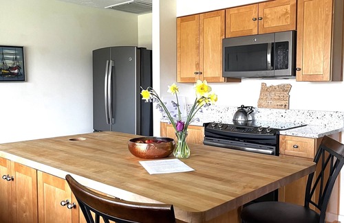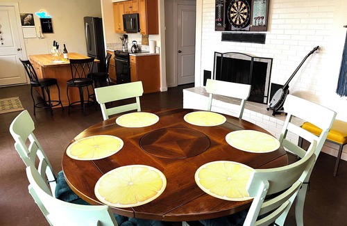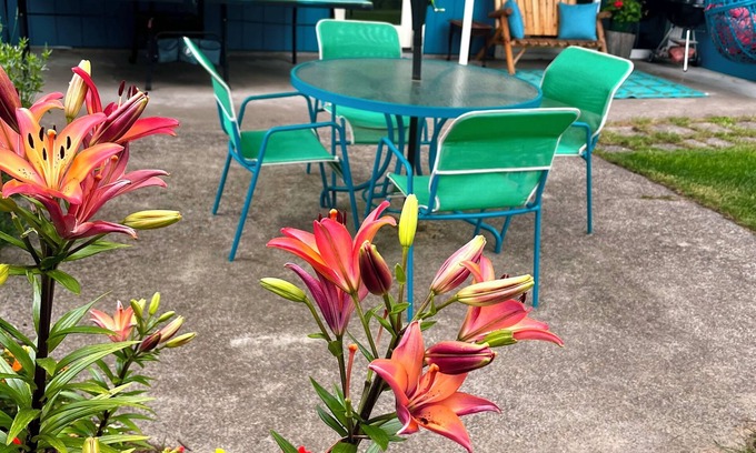 Wonderful for entertaining, family gatherings, special events. Pull into your private driveway, enjoy the large fenced backyard with patio and BBQ grill and fire pit. Enjoy a game of ping pong, or darts on the patio. Chef’s dream open kitchen with coastal mountain sunset view. Pick fresh fruit off the trees and vines. Seasonal plum, pear, blackberry, blueberry and grapes in backyard orchard. Spacious home has new granite countertops throughout kitchen and bathroom & new eco friendly cork floors throughout. Two bedrooms, one queen, two twin beds, large sofa with additional futon for extra sleeping options. Washer/dryer, Roku TV, WiFi, shower/tub, dishwasher, garbage disposal. Short walk to Friendly Market, and the Friendly Gardens food truck courtyard, featuring live music. Sit back and enjoy a relaxing weekend.