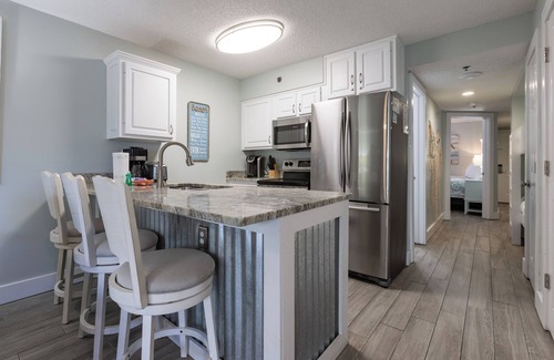 This adorable 1 bedroom, 2 bath, updated condo is brand new to the program and expecting your 5 star review!! Step inside and you will find beautiful LVP flooring throughout, Shiplap walls, Plantation Shutters, fresh accents, updated cabinetry and countertops, and enough square footage for the whole family. The Primary Bedroom contains a King Size bed, TV, spacious closet, and private Full Bath with a beautiful tiled shower. Got littles? They will love sleeping in the twin over twin bunks just outside the bedroom. Got teens? The updated, queen pull out sofa bed in the living room will let them zonk out after a full day in the sun! Then, not to overload mom and dad's bathroom, there is an additional Full Bath just off the hallway for convenience with a shower/ tub combo. Also in the living area is a Large, Smart TV with plenty of seating for everyone, plus balcony access where you can sit outside and enjoy great sunsets and the beach activities of the day. Hungry? The fully equipped kitchen will assist in feeding the fam so you can head out for another adventure.