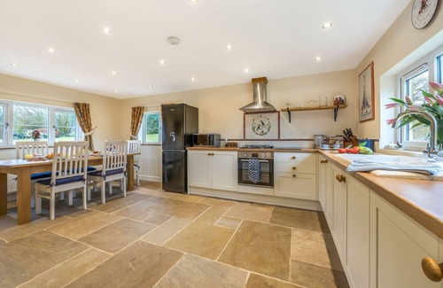 Enter into a spacious and attractive hallway, with a feature staircase to the first floor. The hallway flows through into a large open-plan kitchen/dining area with seating for all guests, all low level shaker style units and stone flooring. The adjoining utility room has a useful washing machine should you need it, and a door leading to the garden. The exquisite sitting room has ample comfortable seating and is full of character and charm. With a stone floor and exposed beams it is very tastefully furnished, ideal for relaxing after a day spent exploring the local area, the sitting room also features french doors leading out to the pretty garden. On the first floor, the beautiful master bedroom has a 6’ super-king size bed, with wonderful garden views to wake up to. The master en-suite bathroom has a feature tiled floor, continuing around the bath and wash basin, adding another touch of luxury. Bedroom two has plenty of space for its twin 3’ single beds and also benefits from an en-suite shower room.