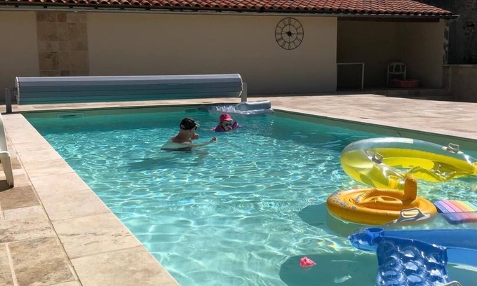 Outside there is the entrance courtyard and main garden, there is seating in front of the gite and a terrace for alfresco dining, and a BBQ. The pool is in a separate walled and fenced garden. The heated 9x4m sloping pool has steps and a 'plage so young children and infants can cool off safely. The pool is cleaned daily, and for safety and insurance purposes the pool is covered between 19:00 and 08:30. The pool is not attended, so strictly no children without an accompanying adult, and please do not take glassware or crockery to the pool. Loungers, umbrellas, and inflatable toys are provided, as well as pool towels. We request that no sunscreens with fake tan or bronzers are used as these damage the pool liner, and guest are required use the shower before entering the pool.