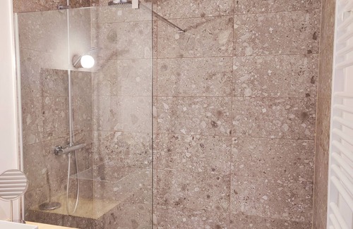 The bathroom has a large shower & there's a separate toilet room.