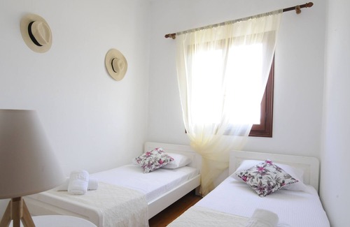 The house was at one time an olive press, still abundantly apparent from the 'litharia' - or thick stone walls - surrounding the home and there is a sitting area in the front patio, an ideal spot for a morning coffee in the shade, under the vine pergola.