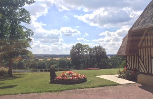 Cottage in its green setting, in the middle of its wooded park, enjoying a superb view of the Normandy grove. Large half-timbered house and thatched roof built in a traditional way in the heart of the Orne, in the Normandy Maine Natural Park and close to the Ecouves Forest. Many historical and natural sites, many hiking trails in this country of breeding and stud farms.