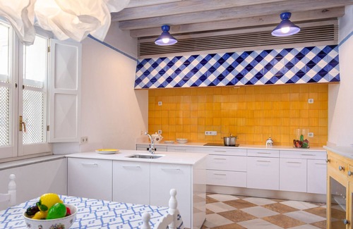 The house stands out for its classic façade and large entrance door that opens to a beautiful typical Sevillian central courtyard, flooding the entire home with natural light. From the courtyard, you enter a spacious fully equipped kitchen with a large dining table for 12 people, ideal for large groups or families.