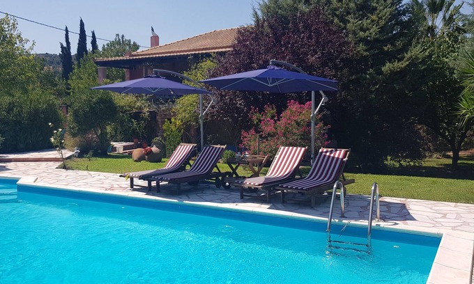 The villa is at the outskirts of a small village named Orologio a very quiet area and there are many beautiful places at close distance such as attractive beaches, mountains for hiking and traditional villages. The villa is surrounded by private area of 2 acres which are suitable for many activities. There are 2 large verandas with view to the garden and pool suitable for dining. Furthermore there is dining area just opposite to the pool. The villa has 4 bedrooms, 2 bathrooms and accommodates 9 guests. There is parking for up to 4 cars. The kitchen includes all the necessary tools and equipments. Also there is a outdoor barbeque working with gaz.