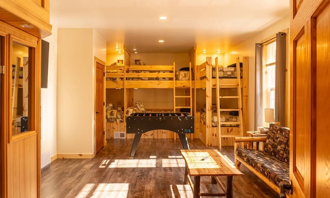 Traverse the stairs to the third floor and you will find a cozy loft with two more bedrooms with ensuite baths and an entertainment area with a sauna and six twin XL bunk beds. This cabin accommodates up to twelve adults!