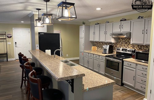 Tailored to accommodate both large and small groups, TrailMix Hideout ensures a comfortable stay for up to 15 guests (extendable to 17). Revel in the expansive outdoors with a generously sized backyard featuring a large firepit and deck equipped with a Blackstone griddle. The front porch invites relaxation amid the picturesque mountainous vistas of West Virginia.