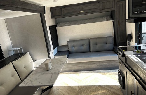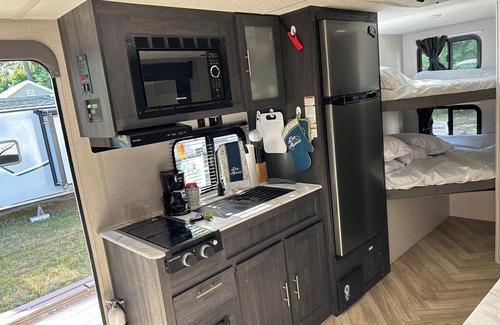 Our trailer gives just that. Offering a Queen size Murphy bed, when not being used you can relax on the couch. The dining couch and table drop down to a Large Twin size bed, along with offering 2 Large twin size bunk beds. The kitchen offers a full size refrigerator and freezer. Farmhouse size sink and 2 propane burners. Supplied is pots, pans, mixing bowls, plates, bowls, cups, mugs, utensils, toaster, hot shot water dispenser for tea or coffee. Bathroom has shower and toilet.