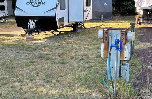 Trailer has hot and cold water, electric, AC, and Sewer, Portable propane grill, Charcoal grill, TV and WIFI
