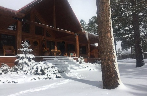 Lovely large log home with outdoor hot tub, TO SLEEP 25 can be rented together with guest cabin ON A SEPARATE LISTING, plus a log barn with a view... only five minutes from the ski slopes and summer mountain activities of Angel Fire Resort.