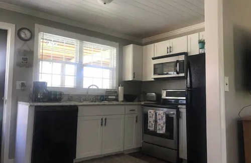 This lovely rental can accommodate up to 7 guests. Completely furnished and beautifully decorated. Full kitchen, dishwasher, central heat/air. One bedroom has full bed and twin bed, one bedroom has a bunk bed (full & twin) and the master bedroom has a queen size bed. Have a den area with a futon that can be used to sleep. There are 2 full bathrooms one has a shower only. Beautiful porch to enjoy your morning coffee and listen to the river. Smart TVs available in living room and 2 bedrooms. Feel free to access your streaming services, no cable. Gas grill available. Fire pit is available. Smoking is not permitted. No pets allowed.