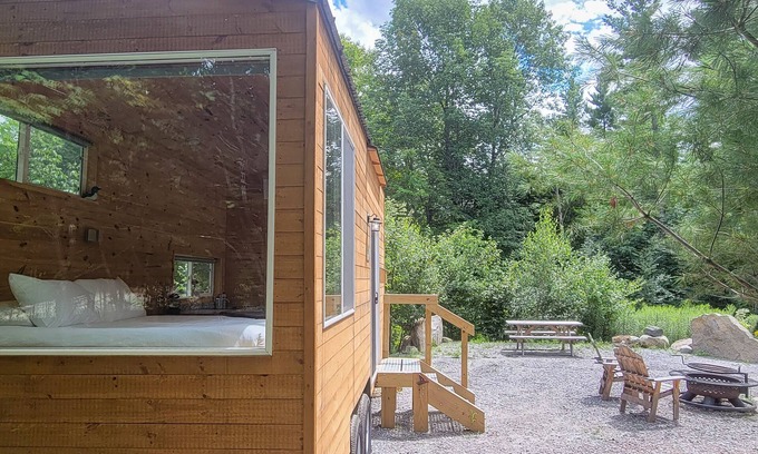 This charming and elegant little cabin will transport you into nature. The feeling of camping outdoors with indoor amenities. Part of the campground, Trailside Stays that is conveniently located alongside the cross country ski and mountain bike trails at Green Woodlands. This tiny house features 1 high quality queen-size bed, linens, kitchenette, large picture windows, bathroom with shower, heating, A/C, outdoor seating, grill top fire pit and high speed fiber internet.