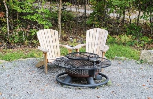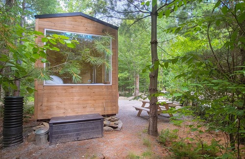 This charming and elegant little cabin will transport you into nature. The feeling of camping outdoors with indoor amenities. Part of the campground, Trailside Stays that is conveniently located alongside the cross country ski and mountain bike trails at Green Woodlands. This tiny house features 1 high quality queen-size bed, linens, kitchenette, large picture windows, bathroom with shower, heating, A/C, outdoor seating, grill top fire pit and high speed fiber internet.