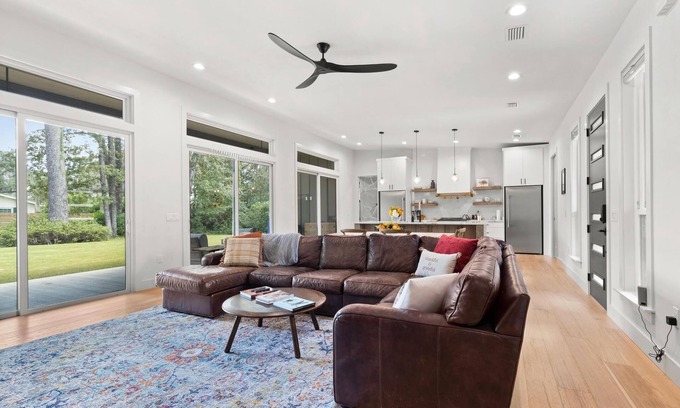 This gorgeous home is a new construction located in the quiet, central neighborhood of Suburban Heights. Approximately 2 miles from UF, this home is on a peaceful street and has a trampoline and grill for tons of outdoor fun! The home has a split floorplan, with a master bedroom with a king bed and double shower on one end, and two bedrooms with queen beds on the other. Between those bedrooms is a small gaming area with another TV. In the house's center is a gorgeous kitchen and dining space.