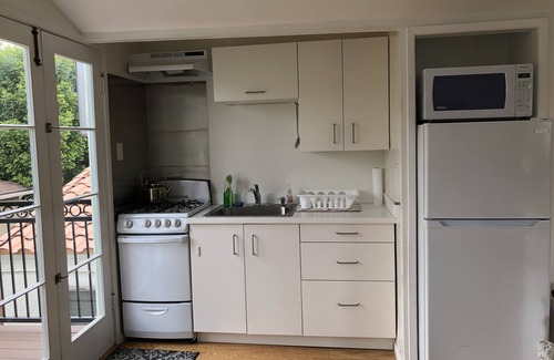 The living room extends out to a spacious sundeck with a view of the San Gabriel mountains. There is a fully equipped kitchen with refrigerator, oven, stove, microwave, coffee maker, toaster, and sink. There is hi-speed wifi and a TV with over a dozen Spectrum TV channels including major networks, sports, kids, and audio music stations. The Roku stick also offers the additional option to stream your own Netflix, Hulu, Sling, or other subscriptions. A hairdryer, iron, and ironing board are provided, as well as basic toiletries. Laundry facilities are available upon request.