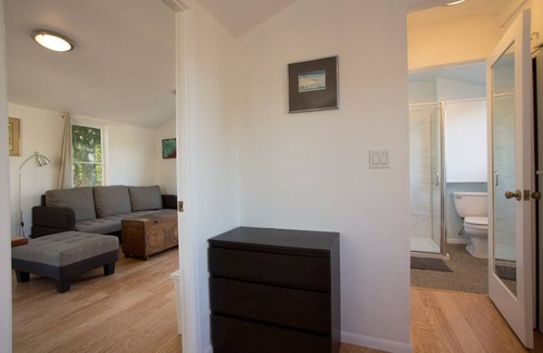 Escape to tranquility in this light-filled, newly remodeled one-bedroom guesthouse apartment on a grand old half-acre Spanish estate. Centrally located in Pasadena with easy freeway access, enter another world as you step under the estate’s redwood, palm, and magnolia trees. Take the stairs to the apartment under a hundred-year-old olive tree. Enjoy the view from the sundeck, and dream away some hours on a hammock in the bamboo grove next to a fish pond, while listening to birds sing.