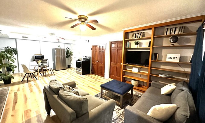 Forget your worries in this spacious and serene space. Stylishly decorated and conveniently located. This private one bedroom apartment has a dedicated entry and separate entrance. Just minutes away from many restaurants, activities, and downtown Gastonia. This apartment is attached to a single-family home, in a family friendly neighborhood. The park like setting of the grounds and backyard provides a peaceful and tranquil escape from the daily grind. Book your next stay today.