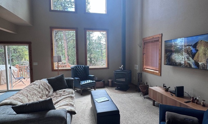 Nestled in the mountains, this delightful house offers a serene escape for guests. With 2 cozy bedrooms featuring a king and queen bed, along with a lovely living room with a sofa bed, this property is perfect for a small group looking for a peaceful retreat. Enjoy the convenience of WiFi, a washing machine, and heating during your stay. Our place will help you feel at home while you're traveling along the peak to peak corridor. This home is nestled among private lakes stocked with trout.