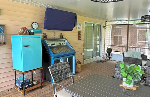 Large front deck, small, screened porch and deck off the master bedroom with seating provided. Large covered/screened back porch which features a large dining table, gas grill, small fridge, games and an intimate lounge space with a fire pit table. And a beautiful view of the water. The large backyard provides space for many games which are included, and a firepit with 6 Adirondack chairs. Just steps away enjoy fishing right off the covered dock featuring a fish cleaning table with running water and power.