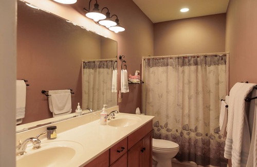 The cabin has a master bedroom with a queen bed, a loft upstairs with one twin bed and one queen bed, moderately sized family seating area, kitchen with table that seats six and two stools at a kitchen bar, one full bath with shower and a half bathroom off the kitchen.